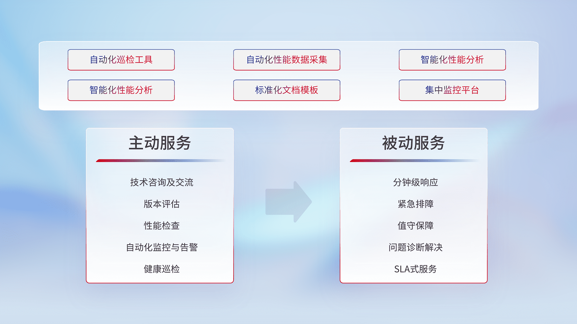 智能化工具和标准化文档,,保障服务质量,,提供主动服务(包含技术咨询、、、版本评估、、性能检查、、、自动化监控与告警、、、健康巡检)和被动服务包含(分钟级响应、、紧急排障、、、、值守保障、、、问题诊断解决、、、SLA服务)。。